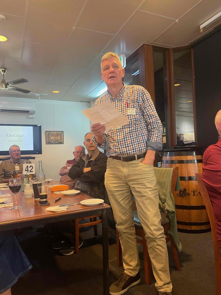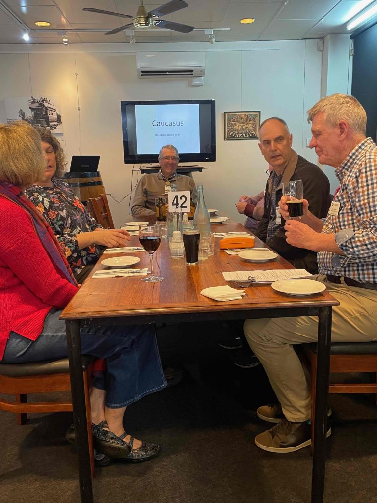 meals, Chairperson David introduced the presentation on the Caucusus (Georgia – the oldest wine producing country, Armenia – known for brandies and other spirits and Azerbaijan – known for its oil), which he and Janice visited in June.